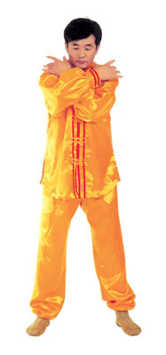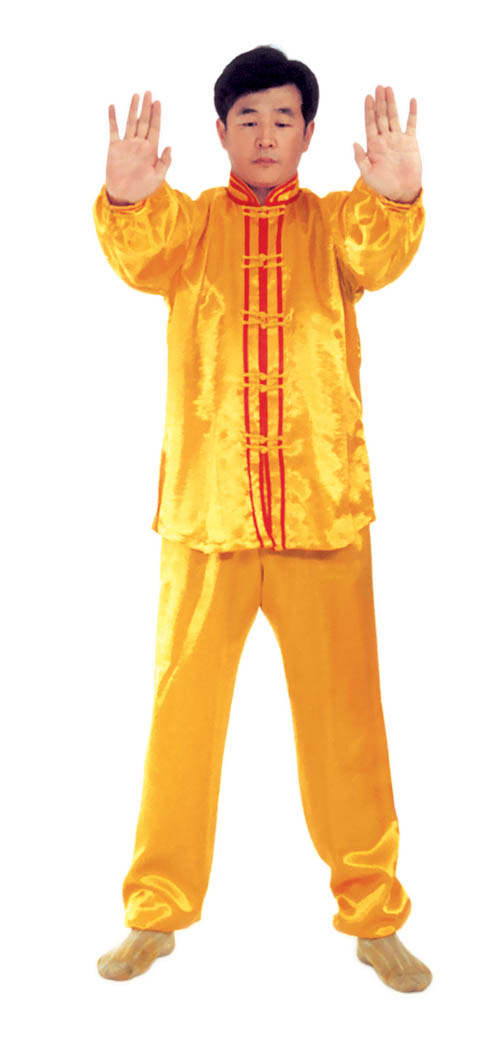 Chưởng chỉ càn khôn[5]: Bắt đầu từ thế “hợp thập”. Hai bàn tay tách ra, cách nhau chừng 2~3cm, đồng thời bắt đầu xoay bàn tay, nam tay trái (nữ tay phải) xoay hướng vào ngực, tay phải hướng ra ngoài ngực, hình thành tay trái ở trên, tay phải ở dưới và cẳng tay giống hình chữ “nhất” (nữ thì trái phải ngược lại), (như hình 1.6) Tiếp theo, cẳng tay trái duỗi thẳng chếch lên bên trái, bàn tay úp xuống, độ cao bàn tay ngang với đầu thì dừng; tay phải đặt chỗ trước ngực, bàn tay ngửa lên. Thuận theo khi tay trái dần dần tới vị trí, thì toàn thân cũng dần dần căng thẳng, đầu dựng lên, chân dẫm xuống. Tay trái duỗi thẳng phía chếch bên trái, tay phải ở trước ngực, bắp tay thẳng hướng phía ngoài (như hình 1.7). Duỗi khoảng 2~3 giây đồng hồ, rồi toàn thân lập tức buông chùng, tay trái lại thu về chỗ trước ngực và cùng với tay phải thành trạng thái “hợp thập”. Sau đó lại xoay bàn tay, triển khai tay phải (nữ tay trái) ở trên, tay trái ở dưới (như hình 1.8). Tay phải lặp lại động tác vừa rồi của tay trái, tức là cẳng tay duỗi chếch sang bên phải, bàn tay úp xuống, bàn tay có độ cao ngang đầu; tay trái vẫn ở chỗ trước ngực, bàn tay ngửa lên. Sau khi duỗi căng xong (như hình 1.9) toàn thân lập tức buông chùng. Thu tay về sau đó hai tay “hợp thập” trước ngực (như hình 1.5)