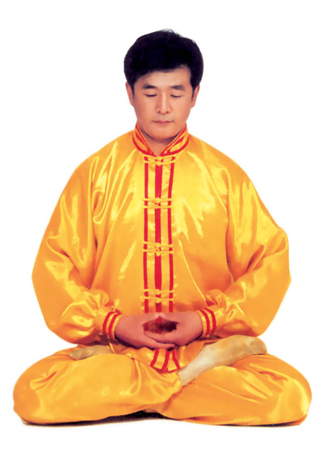 Tu luyện tĩnh công: Tiếp theo tư thế trên, sau đó, tay trên vạch một nửa hình tròn ra phía trước và rơi vào chỗ bụng dưới, hai tay trở thành trạng thái kết ấn (như hình 5.15), tiến nhập vào tu luyện tĩnh công. Nhập định, thời gian càng lâu càng tốt.